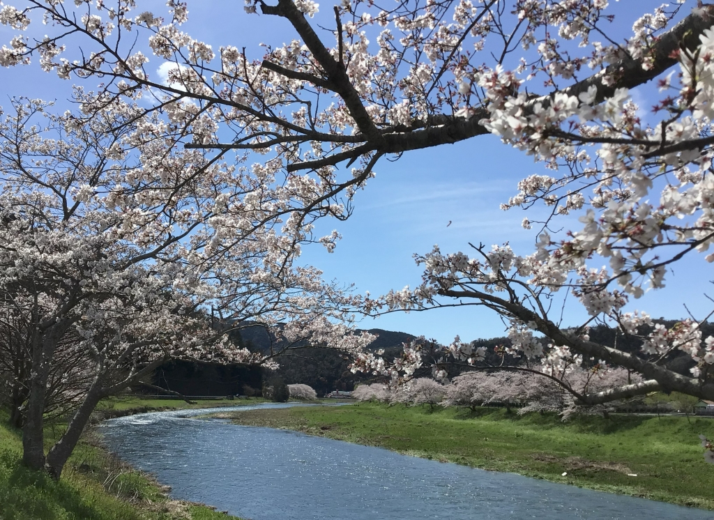 夢前川沿いの桜並木は満開で、青空とのコントラストがとても綺麗でした。